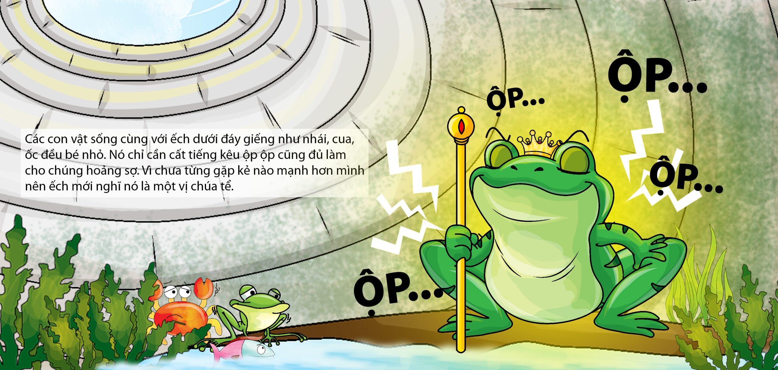 - Hàng ngày, Ếch cất tiếng kêu “ồm ộp” khiến các con vật kia rất sợ.