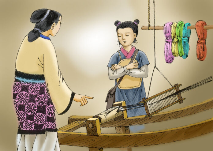 Trong giờ học | Con bỏ học về chơi | Mẹ cắt đứt tấm vải đang dệt bảo con: “Nếu con đang học mà bỏ dở cũng giống như ta đang dệt tấm vải này mà cắt đứt vậy“ |