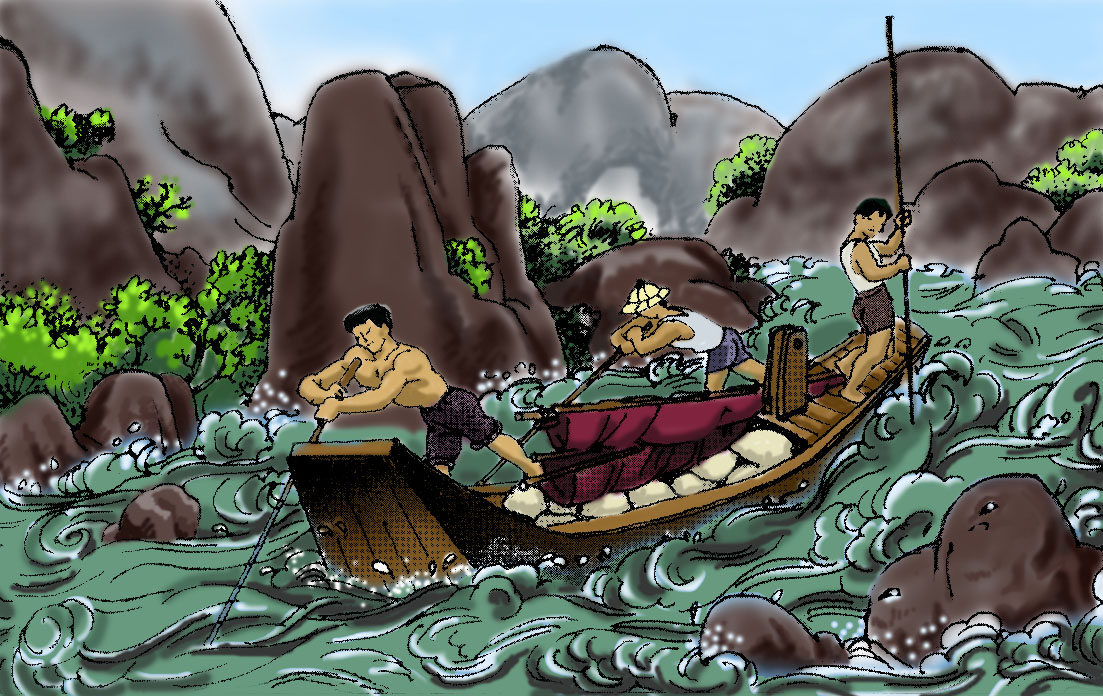 + Từ đầu à thuyền chuẩn bị vượt qua nhiều thác nước: con thuyền qua đoạn sông phẳng lặng.